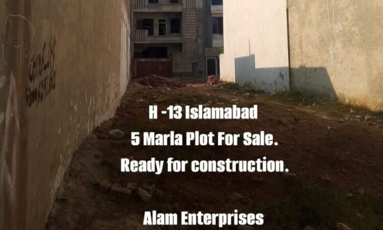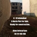 H-13 5 Marla Ready for construction plot for saleBeautiful location plot available for sale in Islamabad !Location : H-13 only place in reasonable rate in IslamabadSize 25*50 (5 Marla)Reasonable demand- Highted plot best place for construct own home- Near sirinagar highway- Near NUST university- Near NUST metro station- Concreted street- Solid land-For more details and visit.===========================.Alam Enterprises (Pvt) Ltd