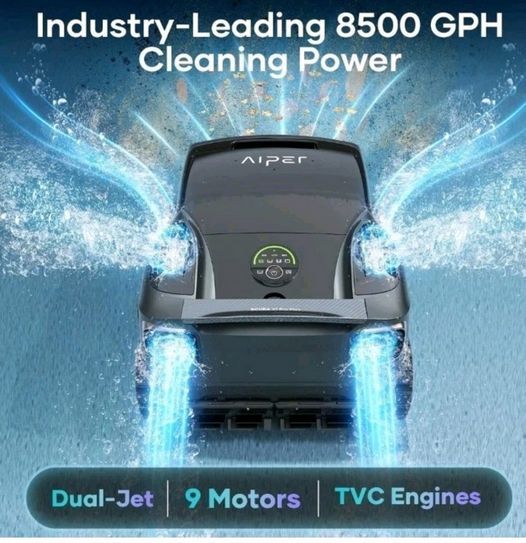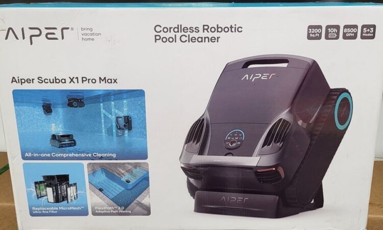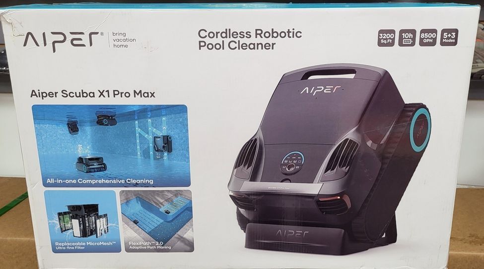 The Aiper Scuba X1 Pro Max All-in-One Pool Cleaning Robot is a brand new, brown robotic pool cleaner suitable for in-ground pools. Made of plastic and metal, this pool cleaning tool is designed to clean all water types and operates on the pool floor. With its all-in-one design, this Aiper model offers efficiency and convenience for keeping pools and spas sparkling clean.