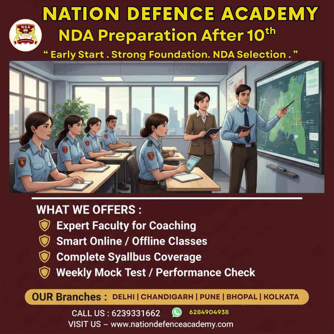 Looking to begin your defence journey early? NDA Preparation After 10th at Nation Defence Academy is planned for understudies who need a focused and disciplined beginning toward a career in the Indian Armed Forces. Our program makes a difference Class 10 pass understudies construct solid basics in Science, English, General Knowledge, along with regular physical fitness fitness and personality development. Guided by experienced staff and defence coaches, understudies get organized classes, study material, mock tests, and doubt-clearing back. The training is adjusted with both academic development and NDA exam prerequisites. We offer offline classroom coaching and online learning choices, with hostel facilities for outstation understudies. Begin early, remain prepared, and move closer to your NDA dream with maste direction.