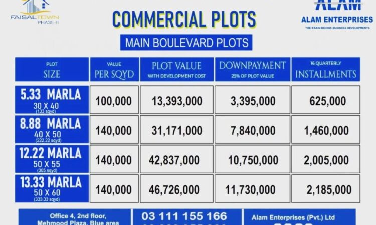 Faisal Town Commercial Plots.Faisal Town phase 230×40 , 50×40, 50x60Mini & Main Boulevard Commercial Plots for sale..5,8,10 Marla & 1 Kanal residential plots also available.very reasonable price including development charges.Golden Chance for invest in Commercial Property..Alam Enterprises (Pvt) LtdHeͤlpliͥneͤ:+923 111 155 166+923 222 255 266.Our Location Islamabad: Blue Area Karachi: Liaquatabad =============================== Please Subscribe our Channel:https://www.tiktok.com/@alamenterprisespvtltd Our Website:https://www.facebook.com/alamenterprises786……..#FaisalTown #faisaltownphase2 #FaisalTownIslamabad #FaisalTownPhaseII #FaisalTownOverseas #FaisalTownOverseasEnclave #ChMajeed #AlamEnterprises #AlamMarketing #Booking #Plots #MultiGarden #FaisalTownBooking #FaisalTownOverseasBlock #FaisalTownOverseasBlockBooking #FaisalTownCommercialPlot #faisaltowncommercial #Commercialplot #CommercialPlotBooking #Alam #AlamMarketing #FT2