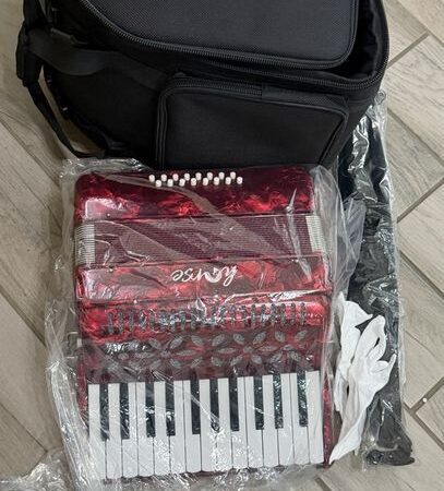 The product is a Horse brand button accordion with 16 bass keys, featuring a distinctive red marble pattern. This traditional size accordion is designed for intermediate level players and comes with a harness strap and case for easy transport and storage. With 24 buttons in total, this accordion offers a wide range of sounds and melodies for folk and world music enthusiasts looking to add a unique and eye-catching instrument to their collection.