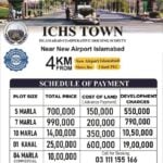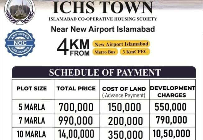ICHS TOWNIslamabad Co-Operative Housing Society.1 Kanal Balloted PlotsTotal Price: 25 lacDown Payment: 6 lacRemaining amount will be paid in 4 years instalments..NOC APPROVED SOCIETYDevelopment Work in fully swings on site.Possession & Non Possession Plots availableContact us for Sale & Purchase..ICHS TOWN03 111 155 16603 222 255 266