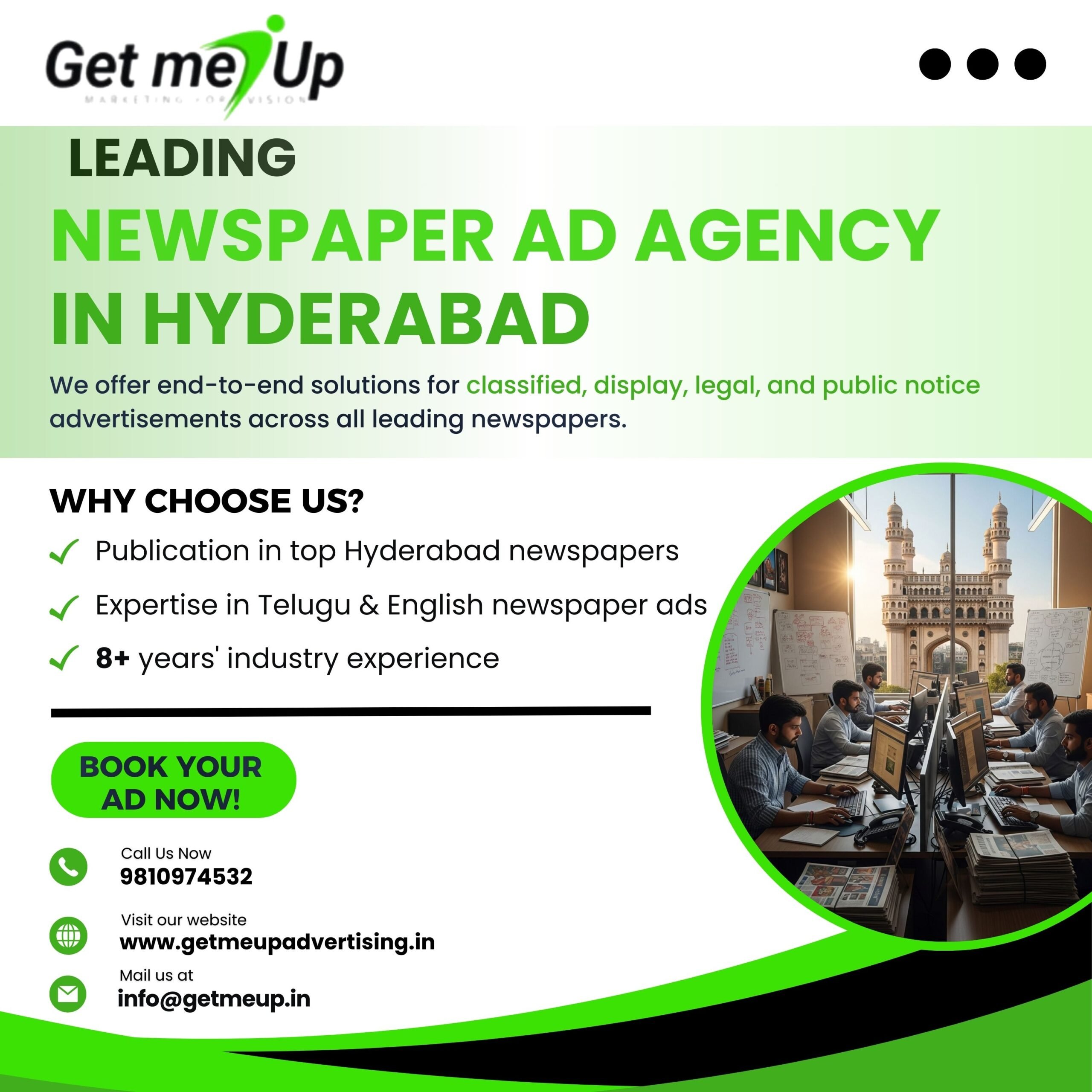 Get your newspaper ad published hassle-free in Hyderabad. Call now at +91-9810974532! Visit: https://getmeupadvertising.in/Hyderabad.html