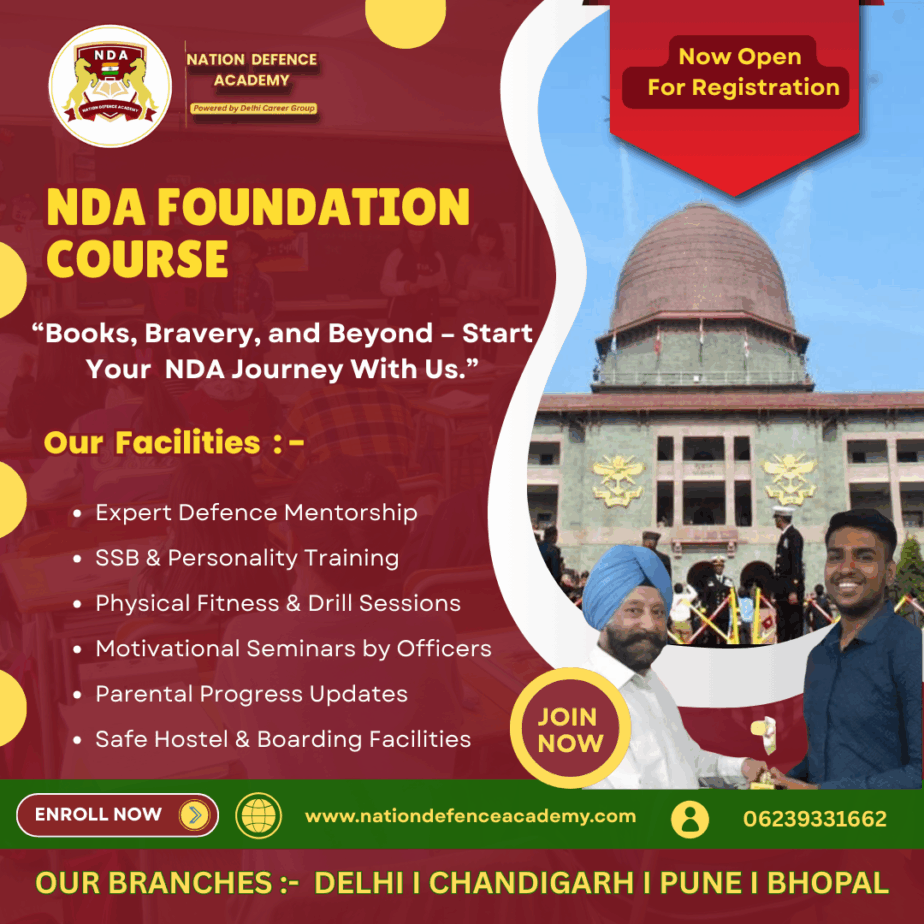 Nation Defence Academy offers a comprehensive NDA Foundation Course in Delhi designed for students after 10th or 12th who aim to join the armed forces. Our experienced faculty, structured study plan, and regular mock tests ensure strong preparation for NDA written exams and SSB interviews. Classes focus on building academic knowledge, physical fitness, and personality development. With small batches and personal attention, every student gets the guidance needed to excel. Join Nation Defence Academy in Delhi and strengthen your future with the best foundation course for NDA, combining discipline, quality education, and expert mentorship for success in defence careers.