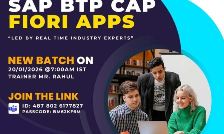 Upcoming New Batch – SAP BTP CAP Fiori AppsTrainer :- Mr. RahulDate:- 20 Jan 2026 | 7:00 AM ISTJoin: https://teams.microsoft.com/meet/4878026177827?p=IFFJFHLPAMPw143GttID – 487 802 6177827 | Password – bM62kF6M