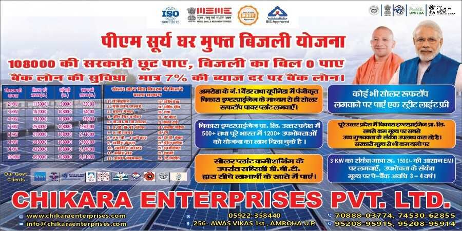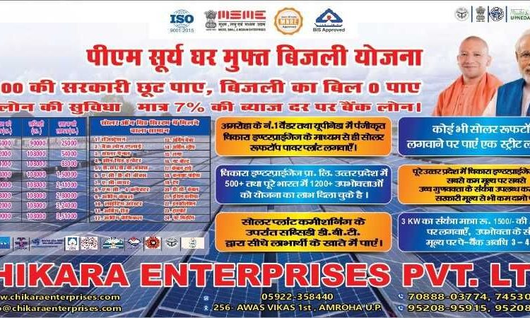 Looking for a PM Surya Ghar Muft Bijli Yojana vendor in Amroha? Chikara Enterprises provides reliable solar panel installation, helping households get government subsidies and free electricity benefits. Choose an authorized vendor for quality service, smooth installation, and maximum savings.